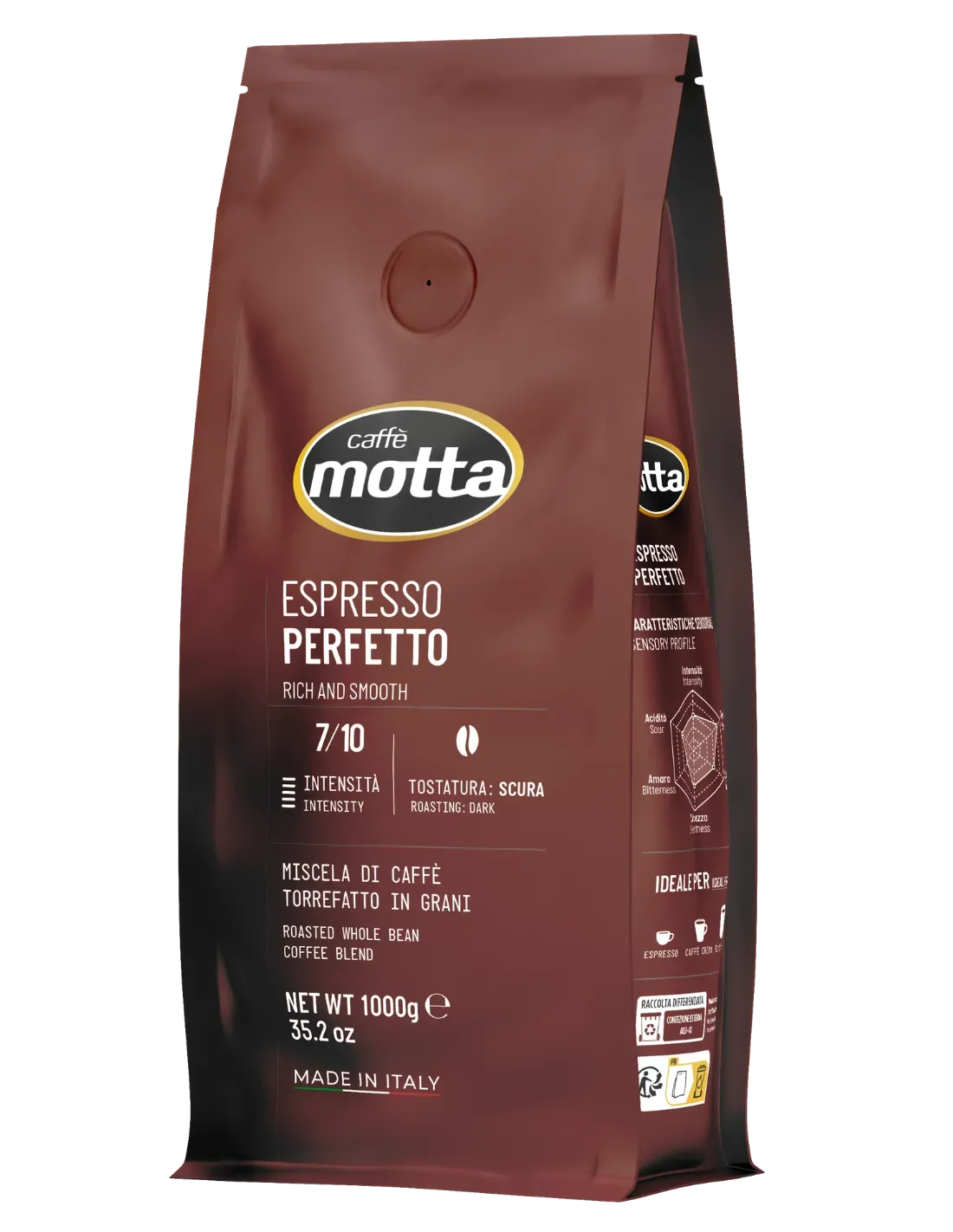 Scopri Caffè Motta Espresso Perfetto in grani da 1Kg: intensità 7/10, gusto equilibrato e cremoso. Tostatura scura